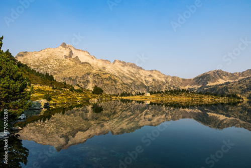 Panoramic view of Lake Aumar at sunrise, reflecting the small house and the mountains of the Néouvielle Nature Reserve