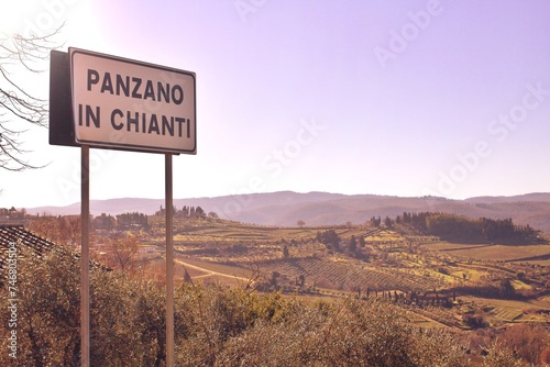 Panzano in Chianti vineyard and panorama at sunset in autumn. Tuscany, Italy Europe.