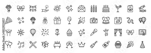 Party and celebration line icon set. Vector pictograms of cake, balloons, fireworks, gifts, and champagne, thin linear illustration.