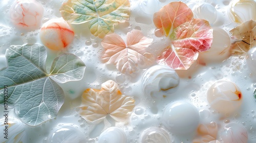 Pastel colored leaves and smooth white marbles arranged in a milky white background.