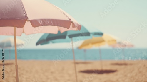 Pastel-colored beach umbrellas softly focused on golden sand with calm sea and bright summer mood