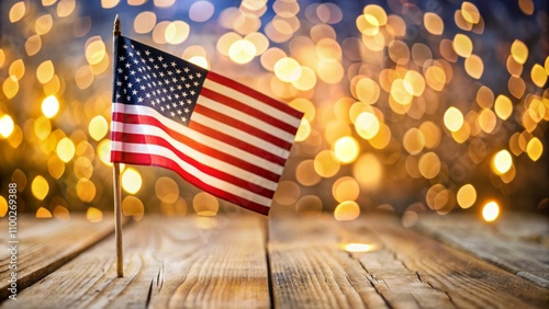 Patriotic American Flag on Wooden Table with Bokeh Lights, American, Flag, Independence, Freedom , patriotism