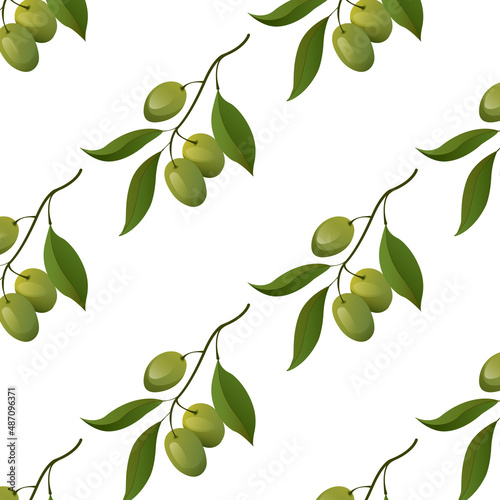 Pattern with green olives on a branch with leaves. Vector illustration.