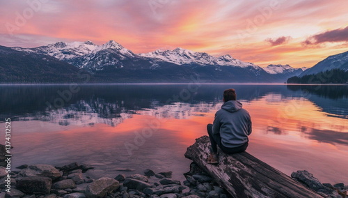 Peaceful mountain scene with a man on a log dock at sunset, looking over a reflective lake. A visual metaphor for solitude, travel, nature connection, and calm mindset.