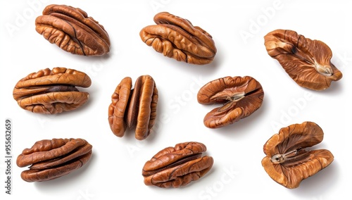 Pecan Nuts in various positions on a white isolated background