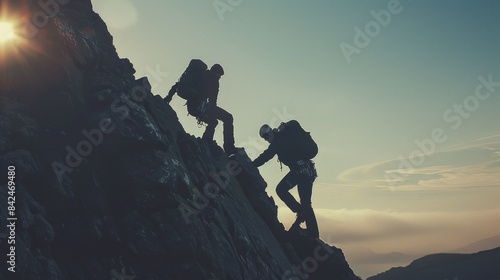 People helping each other hike up a mountain