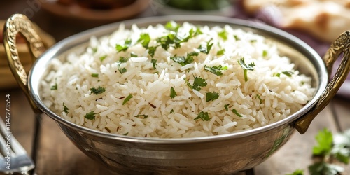 Perfectly cooked basmati rice served in a steel karahi, beautifully garnished with fresh coriander, creating a delightful presentation of basmati rice for any meal.