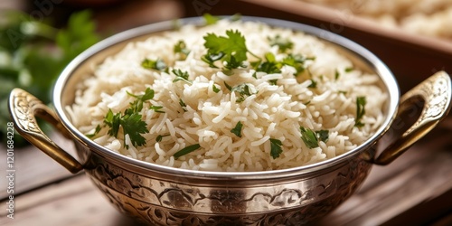Perfectly cooked basmati rice served in a steel karahi, beautifully garnished with fresh coriander, creating a delightful presentation of basmati rice for any meal.