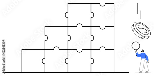 Person balancing a sphere near a stacked puzzle block structure and a falling coin. Ideal for teamwork, challenges, problem-solving, balance, critical thinking, risk, investment, simple landing page