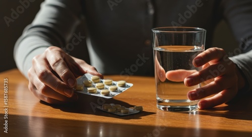 Person holding medication and glass of water on wooden table