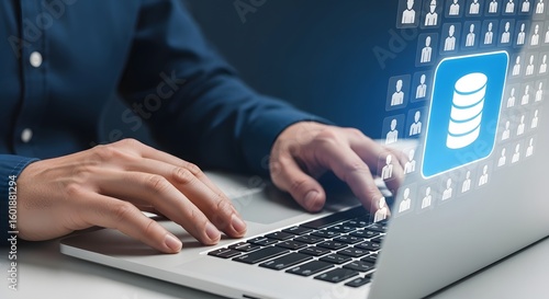 Person typing on a laptop with database and user icons displayed on the screen interface view