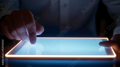 Person Using Touchscreen Tablet with Backlit Display in Dark Room