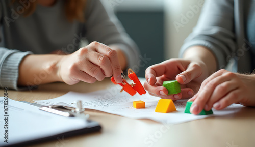 Person with disability playing with colorful beads, concept of motor skills, rehabilitation therapy and creativity.