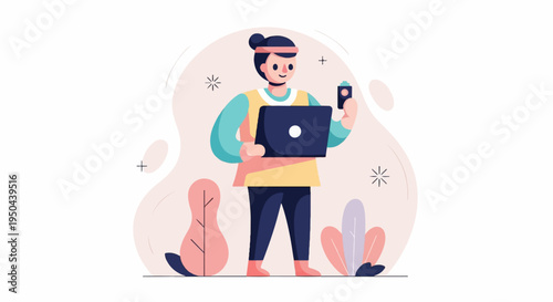 Person with laptop and phone in stylized, cheerful outdoor setting