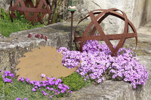 phlox blüht zwischen rostfiguren