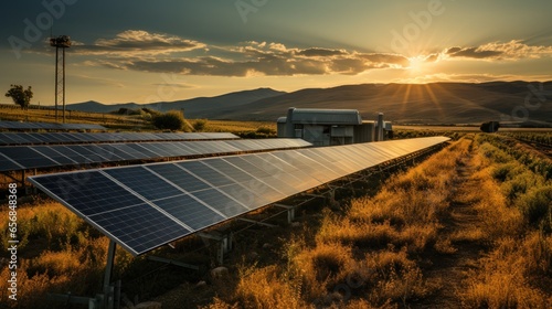 Photo collage of sunset and solar panels, beautiful photovoltaic