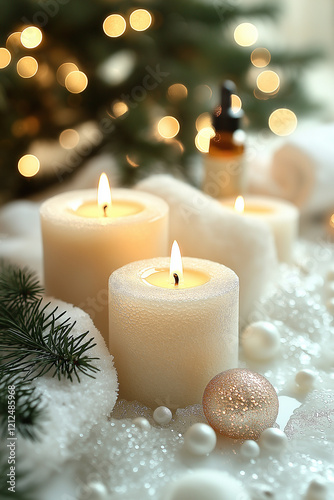 Photo de bougies blanches allumées dans une ambiance hivernale festive, entourées de décorations de Noël, de branches de sapin, d’ornements dorés et d'un flacon d'huiles essentielles