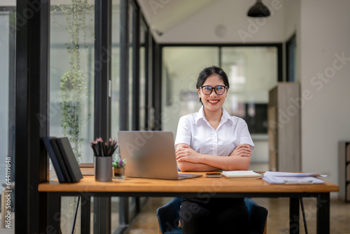 Photo of businesswoman in goggles working with laptop computer with paperwork at desk in a modern office.