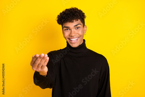 Photo of cute pretty dark skin guy dressed black turtleneck ask give him money isolated yellow color background