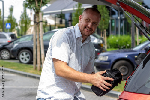 Photo of man putting bags in the car trunk. Businessman is unpacking the car trunk.Man packing luggage in car ready for road trip.Young Caucasian man loading the trunk of the car parked on the parking