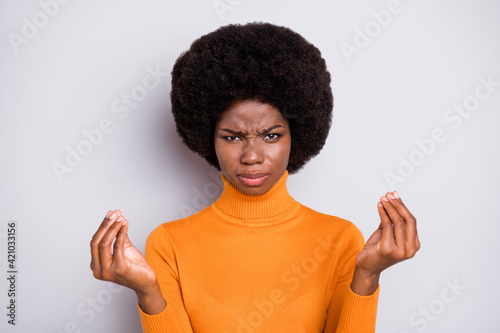 Photo of young african woman unhappy sad ask money problem poor bankrupt isolated over grey color background