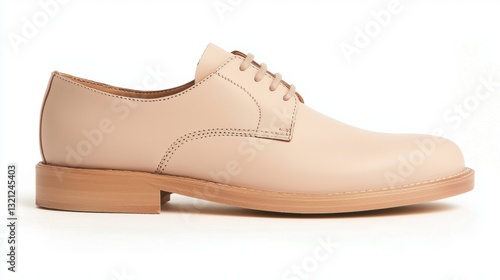 Photograph of a beige-colored shoe. the shoe has a round toe and a low heel. the upper part of the shoe is made of leather, with a smooth finish. the laces are white and are tied in a neat knot.