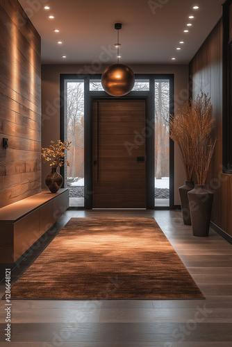 Photographie immobilière d’un hall d’entrée moderne avec tapis géométrique et suspension design. HDR, 3D, tendance, architecte