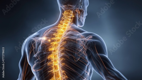 Photorealistic image of a man with back pain, holding his lower back, with the spine skeleton highlighted to indicate discomfort and strain, generative ai illustration.