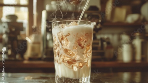 Photorealistic soda glass swirl with vintage kitchen background effect