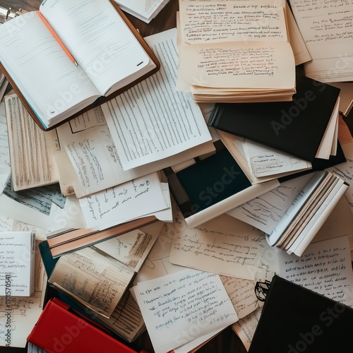 pile of papers, notebooks and books on the table, top view --v 6.1 Job ID: ec6e3693-2ee9-413b-acd3-596ffb162dcb