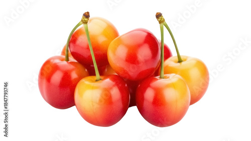 Pile of Rainier cherries isolated PNG, fresh yellow and red fruit with stems for healthy eating and summer desserts on transparent background