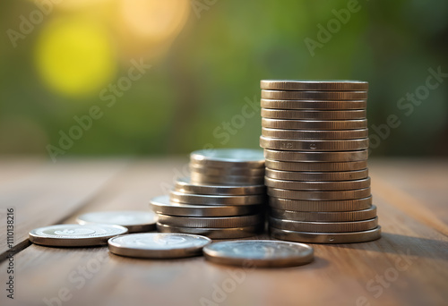 Piles of coins on a wooden table with natural lighting, representing personal finance and budgeting. Generative AI