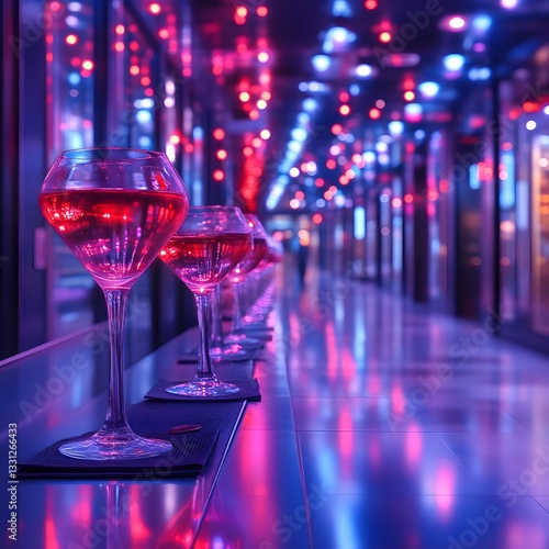 Pink cocktails line a vibrant neon-lit bar