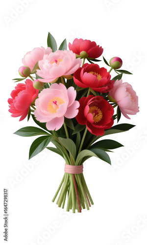 Pink Peony Bouquet with Red Accents, Blooming Flowers on Transparent Background, Digital Illustration for Web Design