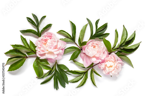 Pink peony flowers and green leaves on a white background. Isolated. Top view.