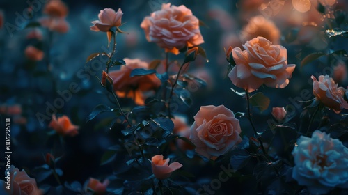 Pink roses bloom under a mystical moonlight, their petals catching the dim sparkles, suggesting enchantment and beauty