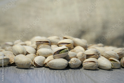 pistachio nuts on wooden background. selective focus, blurred background.