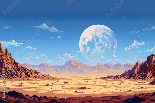 Pixel Art Desert Landscape with Mountains Under Clear Blue Sky and a Giant Moon in the Distance
