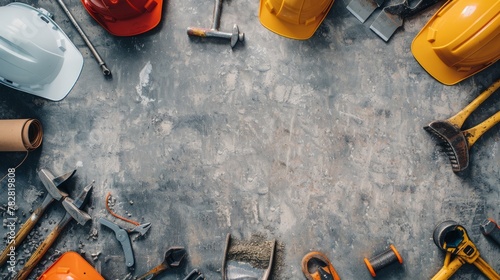 Plain background with worker tools frame. Happy labor day and international workers day.