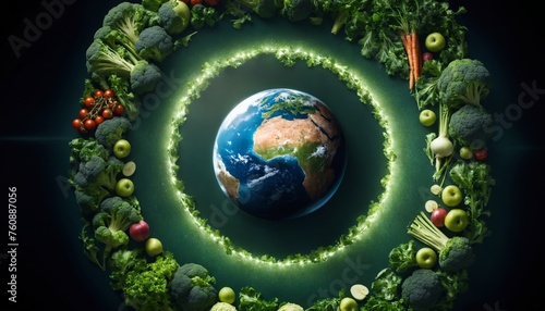Planet Earth, surrounded by wholesome foods and plants. Digital art style. Eco concept. Earth Day. For banner, poster, cards, background, eco campaign.