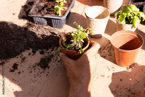Planting seedlings in small pots, person gardening with soil and plants, at home