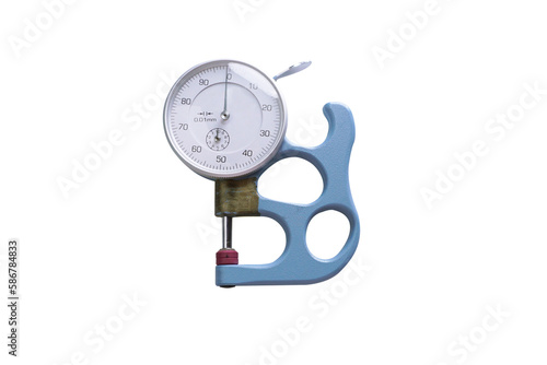 Plastic thickness gauge isolated on white background, A handy type measuring instrument that can measure the plastic thickness Sheet-shaped items.
