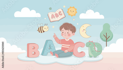 Playful baby exploring alphabet blocks in a sunny outdoor scene.