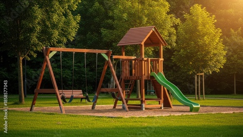 Playground equipment, swings and slide on a sunny day in a grassy park setting