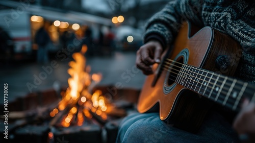 Playing Acoustic Guitar by Campfire at Night with Warm Firelight and Cozy Atmosphere