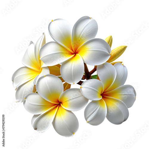 Plumeria cluster white petals, yellow centers. Isolated on black