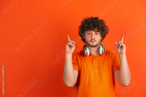Pointing, choosing. Caucasian young man's monochrome portrait on orange studio background. Beautiful male curly model in casual style. Concept of human emotions, facial expression, sales, ad.