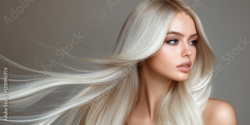 portrait of a blonde with straight shiny hair flowing to the side