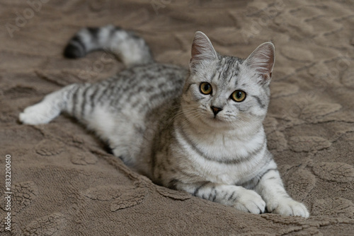 Portrait of a British Shorthair tabby cat lying on a blanket