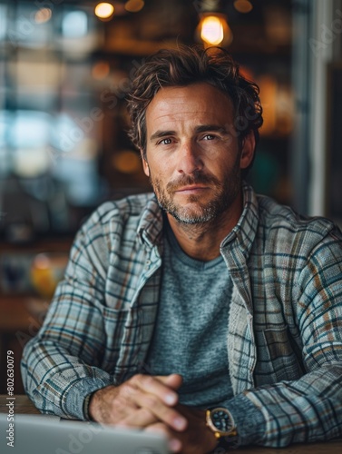 Portrait of a casual, middle-aged man sitting inside, staring at the camera with a slight smile